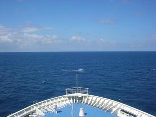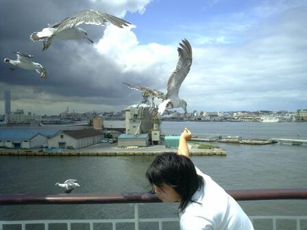 10時30分定刻通りの出港。見送りの係りの人に手を振ってお別れした後、持参の"かっぱえびせん"を取り出します。お腹がすいた訳ではなくて、飛んでくるかもめにあげるのです。手を高く差し出すと直接くわえて行くのはちょっとスリルがあって面白く、今回もわざわざ買って来ました。船室に戻ってちょっと早めの昼食は乗船前に買ったコンビニのおにぎり。持参のDVDプレーヤーで映画を観ながら、主人は早くも3本目のビールに手が伸びています。