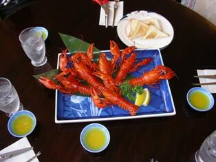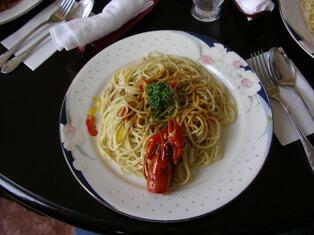 お目当てのレストラン&ホテル"レイクスパたかだ"に行き、レイクロブスター(ウチダザリガニ)のパスタを食べる。このパスタのクリーム系のソースはロブスターの旨みが濃厚に出ていて絶品です。小さなトーストが付いてくるので、文字通り皿をなめるように食べつくしました。ホテルの社長に主人がウチダザリガニのボイル(メニューに無い)は出来ないかと聞くと、ボイルに時間がかかるので予約がないと作れないとの返事。主人が非常に残念がっていると、社長が厨房を確認してきてくれて、1時間待てば作ってくれると言われ、迷わず注文…ちょっと高いので2人前。(20pほどが3匹で1人前2,000円)