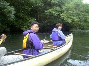 12時過ぎ。お待ちかねのカヌーツアーは屈斜路湖畔コタンより親子別々に2艇に別れスタートです。湖をしばらく漕いで行くと、屈斜路湖から唯一流れ出ている釧路川へと吸い込まれていきます。釧路川の透明度は非常に高く、昨日食べたウチダザリガニが見えます。ガイドのお兄さんが屈斜路湖でもたくさん取れると言うと、主人が一言「今日の食材は決まり!」と言っているが、大丈夫? 本人は昔取った杵柄で、ザリガニ釣りは得意らしいが、期待しないでおこう。自分で取ったザリガニを食べるのはちょっと抵抗あるし…。