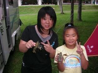 キャンプサイトに戻り、目の前の湖畔に直行。まずは寄せ餌にと桟橋からスルメイカを落とすと、果たしてザリガニが現れる。主人は手に持ったスルメイカを直接水に突っ込むと、すんなり釣れてしまいました。こうなってくると子供たちも目の色が変わり、糸に結んだスルメイカを持って大騒ぎ。一時間位で約30匹捕まえました。ウチダザリガニはアメリカザリガニと違って、生きているうちは青い色をしているが茹でると真っ赤になります。肝心の味はといえば、やっぱりえびの味。期待していた爪の肉は、大きい固体が釣れなかった為食べられませんでした。